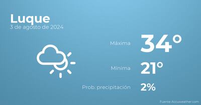 En las primeras horas del día en Luque se esperan más nubes que claros. A medida que avance el día tendremos nubes y claros con poca probabilidad de precipitaciones. Las temperaturas se moverán entre una máxima de 34 y una mínima de 21 grados centígrados. Junto a todo esto, se esperan vientos del norte sin apenas intensidad con cifras de hasta 43 kilómetros por hora.