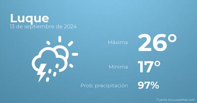 Para las primeras horas del día en Luque se prevén más nubes que claros con tormentas acompañadas de lluvia. Según pasen las horas el cielo estará cubierto con lloviznas generalizadas. En relación a las temperaturas, estas oscilarán entre una máxima de 26 y una mínima de 17 grados centígrados. Además, se esperan vientos del noroeste de carácter débil con cifras de hasta 32 kilómetros por hora.