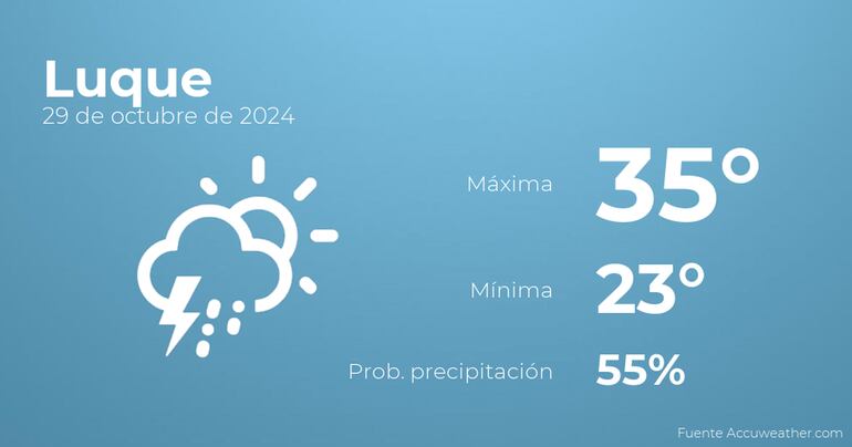 Para las primeras horas del día en Luque se esperan nubes y claros con probabilidad de tormentas y lluvia. Por la tarde habrá cielos sin nubes. Con respecto a las temperaturas, variarán entre una máxima de 35 y una mínima de 23 grados. Junto a todo esto, se esperan vientos del este de poca intensidad con valores de hasta 26 Km/h.