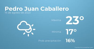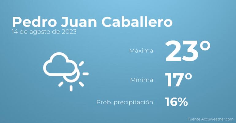 En la mañana de hoy en Pedro Juan Caballero habrá más nubes que claros con escasa probabilidad de precipitaciones. Según pasen las horas se esperan nubes y claros con poca probabilidad de precipitaciones. Por lo que respecta a las temperaturas, estas variarán entre los 23 grados de máxima y 17 de mínima. Además, se esperan vientos del noreste de poca intensidad con valores de hasta 26 Km/h.