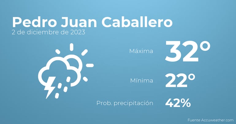 A lo largo de la mañana en Pedro Juan Caballero tendremos más nubes que claros con probabilidad de tormentas acompañadas de lluvia. Por la tarde habrá nubes y claros con poca probabilidad de lluvias. En relación a las temperaturas, estas oscilarán entre una máxima de 32 y una mínima de 22 grados centígrados. Viento de poca intensidad con cifras de hasta 39 Km/h.