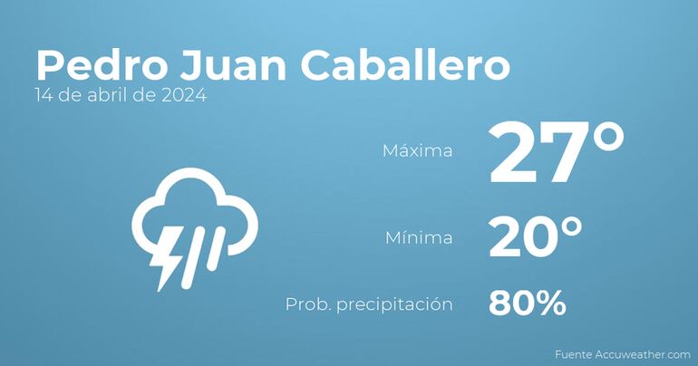 A lo largo de la mañana en Pedro Juan Caballero el cielo estará cubierto con tormentas acompañadas de lluvia. A medida que avance el día el cielo estará cubierto con probabilidad de lloviznas generalizadas e intermitentes. En cuanto a las temperaturas, estas se moverán entre una máxima de 27 y una mínima de 20 grados. Además, se esperan vientos de carácter débil con valores de hasta 33 kilómetros por hora.