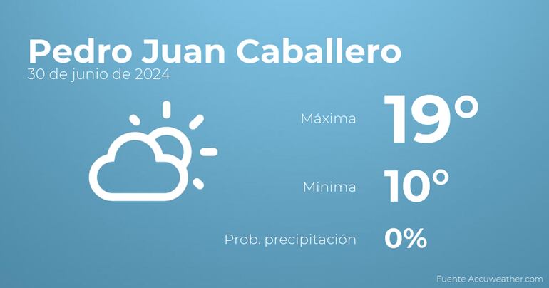 Para las primeras horas del día en Pedro Juan Caballero tendremos pocas nubes. A medida que avance el día habrá cielos sin nubes. Por lo que respecta a las temperaturas, estas variarán entre los 19 grados de máxima y 10 de mínima. Viento del sureste de poca intensidad con cifras de hasta 24 Km/h.