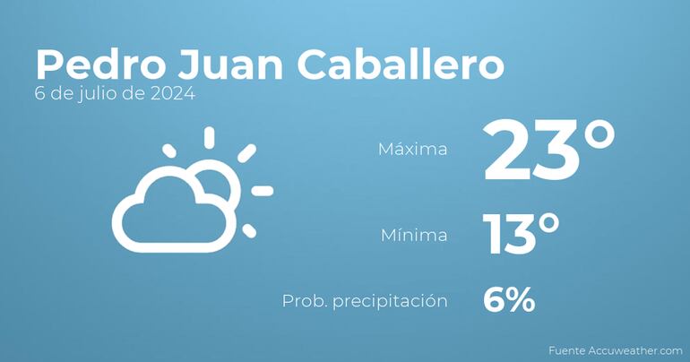 En la mañana de hoy en Pedro Juan Caballero tendremos nubes y claros. Por la tarde habrá cielos nubosos con poca probabilidad de lluvias. En relación a las temperaturas, estas oscilarán entre una máxima de 23 y una mínima de 13 grados centígrados. Además, se esperan vientos del oeste de poca intensidad con rachas de hasta 24 kilómetros por hora.