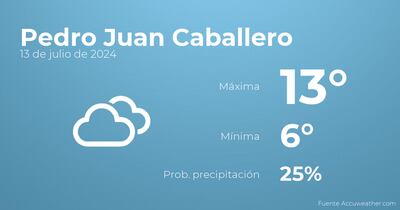 A lo largo del día de hoy en Pedro Juan Caballero tendremos cielos cubiertos con baja probabilidad de que haya precipitaciones. En cuanto a las temperaturas, variarán entre una máxima de 13 y una mínima de 6 grados centígrados. Junto a todo esto, se esperan vientos de poca intensidad con cifras de hasta 32 kilómetros por hora.