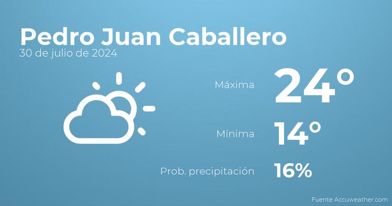 Para hoy por la mañana en Pedro Juan Caballero habrá nubes y claros con baja probabilidad de que haya precipitaciones. Según pasen las horas tendremos cielos despejados. En relación a las temperaturas, estas variarán entre los 24 grados de máxima y 14 de mínima. Viento de carácter flojo con cifras de hasta 30 kilómetros por hora.