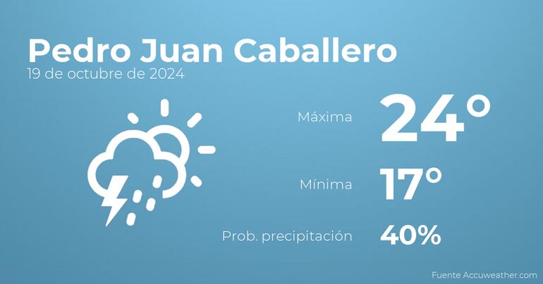 A lo largo de la mañana en Pedro Juan Caballero se prevén más nubes que claros con probabilidad de tormentas y lluvia. Según pasen las horas se esperan más nubes que claros con poca probabilidad de lluvias. Con respecto a las temperaturas, estas se moverán entre una máxima de 24 y una mínima de 17 grados. Junto a todo esto, se esperan vientos del sur de carácter débil con cifras de hasta 24 kilómetros por hora.