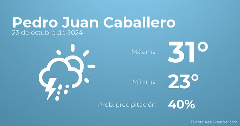 Hoy por la mañana en Pedro Juan Caballero habrá nubes y claros con probabilidad de tormentas y lluvia. A medida que avance el día se prevén cielos sin nubes. Con respecto a las temperaturas, estas variarán entre los 31 grados de máxima y 23 de mínima. Viento del norte de carácter débil con rachas de hasta 33 Km/h.