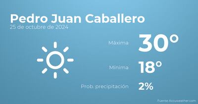 Para las primeras horas del día en Pedro Juan Caballero se prevén cielos despejados. Según pasen las horas habrá más nubes que claros con tormentas y lluvia. Por lo que respecta a las temperaturas, estas variarán entre una máxima de 30 y una mínima de 18 grados. En general, vientos sin apenas intensidad con valores de hasta 30 kilómetros por hora.