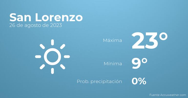 Para hoy por la mañana en San Lorenzo se prevén cielos despejados. Por la tarde tendremos cielos sin nubes. Las temperaturas se moverán entre una máxima de 23 y una mínima de 9 grados centígrados. Junto a todo esto, se esperan vientos de poca intensidad con cifras de hasta 43 Km/h.