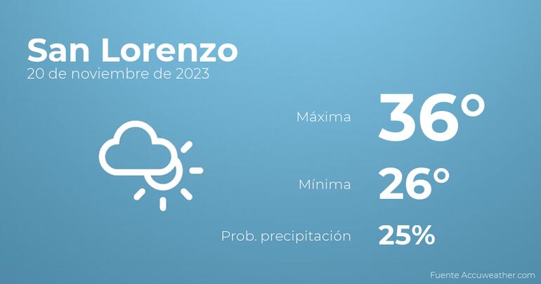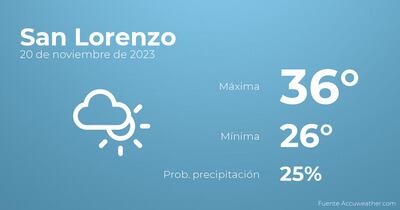 A lo largo de la mañana en San Lorenzo tendremos más nubes que claros con baja probabilidad de que haya precipitaciones. Por la tarde se prevén nubes y claros. Por lo que respecta a las temperaturas, estas se moverán entre una máxima de 36 y una mínima de 26 grados centígrados. Junto a todo esto, se esperan vientos de carácter flojo con valores de hasta 43 Km/h.