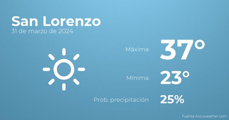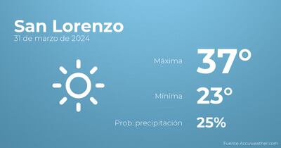 Para hoy por la mañana en San Lorenzo tendremos cielos sin nubes con poca probabilidad de precipitaciones. Según pasen las horas se prevén nubes y claros con probabilidad de tormentas y lluvia. En relación a las temperaturas, estas se moverán entre una máxima de 37 y una mínima de 23 grados. En general, vientos de carácter débil con valores de hasta 35 Km/h.