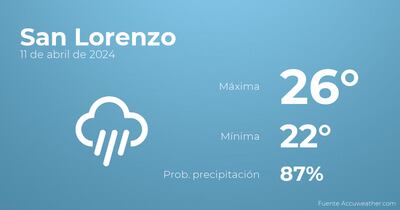 En la mañana de hoy en San Lorenzo el cielo estará cubierto con lluvia. Por la tarde se prevén nubes y claros con escasa probabilidad de precipitaciones. En relación a las temperaturas, estas variarán entre los 26 grados de máxima y 22 de mínima. Además, se esperan vientos del sur de poca intensidad con valores de hasta 26 Km/h.