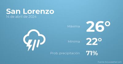 En la mañana de hoy en San Lorenzo habrá cielos cubiertos con probabilidad de tormentas y lluvia. A medida que avance el día el cielo estará cubierto con lloviznas generalizadas. Las temperaturas estarán entre una máxima de 26 y una mínima de 22 grados. Junto a todo esto, se esperan vientos del noreste de poca intensidad con rachas de hasta 32 kilómetros por hora.