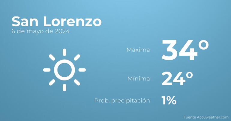 A lo largo de la mañana en San Lorenzo se esperan cielos despejados. Por la tarde tendremos nubes escasas. Con respecto a las temperaturas, oscilarán entre una máxima de 34 y una mínima de 24 grados. Además, se esperan vientos de carácter débil con valores de hasta 43 Km/h.