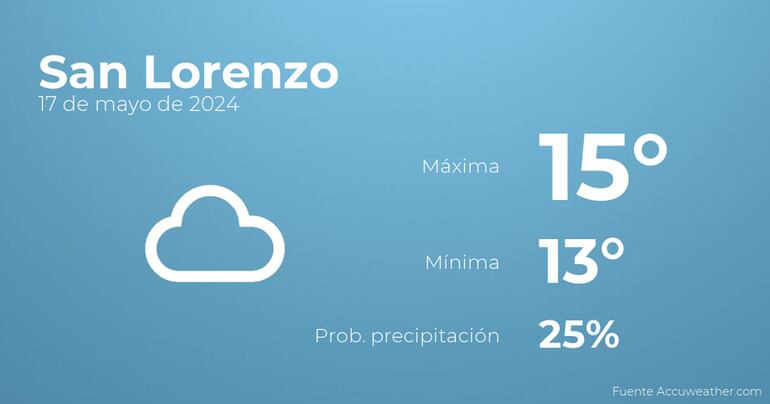 Para el día de hoy en San Lorenzo estará muy nublado con poca probabilidad de precipitaciones. Las temperaturas se moverán entre una máxima de 15 y una mínima de 13 grados. Viento del sur de poca intensidad con cifras de hasta 37 kilómetros por hora.