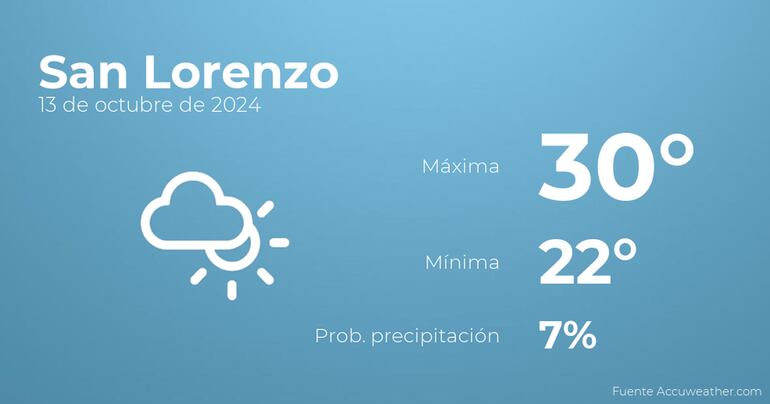 Hoy a primera hora en San Lorenzo tendremos más nubes que claros. Según pasen las horas se prevén más nubes que claros con probabilidad de tormentas y lluvia. Con respecto a las temperaturas, oscilarán entre una máxima de 30 y una mínima de 22 grados. Además, se esperan vientos del noreste de carácter débil con rachas de hasta 26 kilómetros por hora.