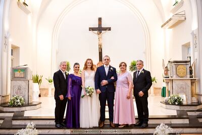 Terminada la ceremonia religiosa los recién casados y sus invitados fueron hasta TIAM Centro de Eventos, para disfrutar de la fiesta bajo la coordinación de Majo Bogado, para The Perfect Day. La deco fue montada con flores naturales blancas y pequeños detalles en amarillo, el color favorito de la novia. El menú estuvo a cargo de Marta Elena Catering.