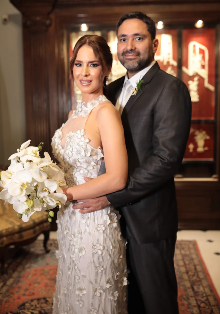 Monserrat lució un vestido que fue traído de los Estados Unidos, especialmente para la ocasión. El tocado fue trabajado en Morel Atelier y del ramo se encargó Keiki.
