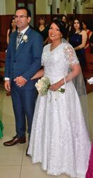 La novia lució un diseño romántico confeccionado y diseñado por su madre, y el tocado fue una creación de GC Tocados, peinada por Jaime Román y maquillada por Rita Roa del salón Osvaldo Bucci.