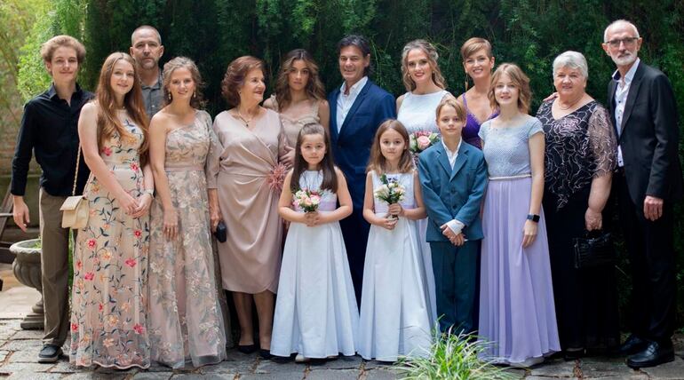 La novia lució muy sofisticada y fresca, ella llevó un vestido blanco clásico diseñado y confeccionado por Laura Benítez y portó un delicado ramito hecho con rosas blancas y rosadas, también con gipsofilas. El tocado fue trabajado por Zuni Vega.