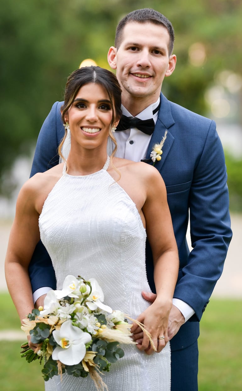 La novia lució un elegante vestido muy moderno confeccionado por Ocre. Los zapatos fueron de Olinda y fue maquillada por Claudio Ferreira, y peinada por Yonatan Chaparro. El tocado fue una creación de Liraló. El novio llevó un traje de Sportfino.