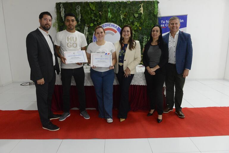 La entrega de las becas reunió este mediodía a autoridades de la universidad privada, los tres beneficiados y la diputada Rocío Abed de Zacarías, en el futuro Hospital Escuela de la universidad en el kilómetro 8, lado Monday de Ciudad el Este.