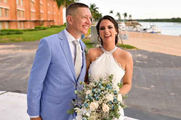La novia lució un vestido diseñado por Sarey con bordados, de estilo romántico. En el cabello llevó un arreglo con orquídeas naturales. El ramo fue armado por Myrian Doldán, quien también decoró la celebración.