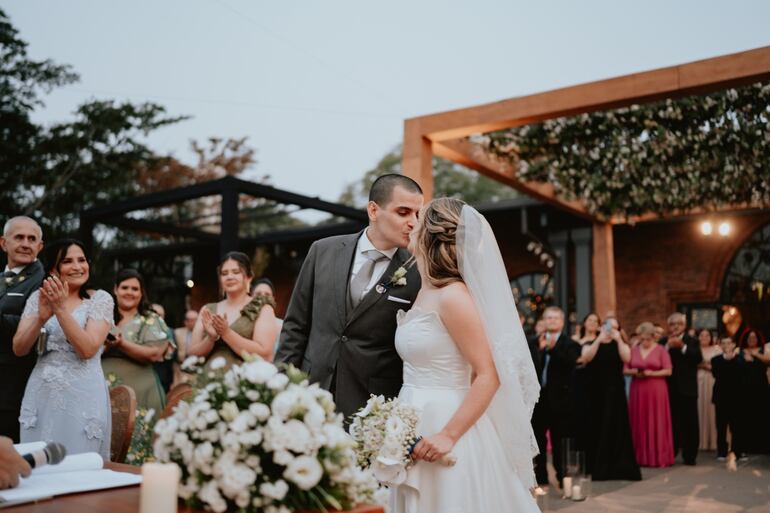 La novia lució un delicado vestido confeccionado por Ofelia Otello de estilo moderno y minimalista con detalles en punta del escote, tajo con vuelo y un velo con encaje orgánico que cubrió el rostro de la novia, mientras que el novio lució un impecable traje de Giorgio. Las madrinas de la boda fueron vestidas por Irma Mereles y los padrinos por Giorgio.