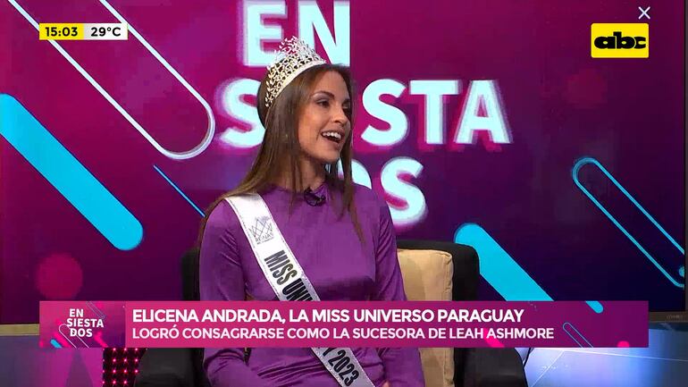 Este artículo tiene 2 años de antigüedad Elicena Andrada Orrego, de 28 años, es la nueva soberana del título Miss Universo Paraguay. La top reside en España desde su infancia y participó del certamen Reinas del Paraguay en la edición 2022, donde quedó como virreina del título de Miss Mundo, pero este año volvió por la revancha y logró consagrarse como la sucesora de Leah Ashmore.