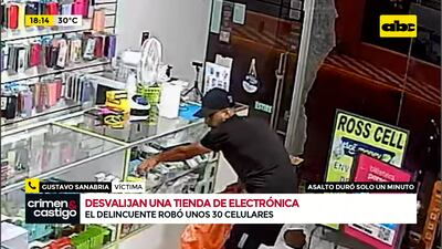 Este artículo tiene 2 años de antigüedad Las cámaras de seguridad grabaron íntegramente el robo, que duró un minuto, tiempo en el cual el maleante tomó la mayor cantidad de celulares que pudo, así como un monitor de TV y luego salió de nuevo, como si nada.