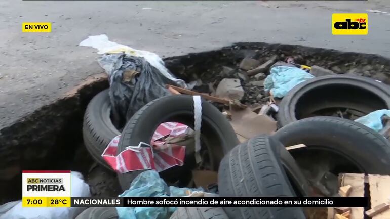 Este artículo tiene 5 años de antigüedad Sobre la calle Teniente Ayala Velázquez casi España, un gran bache dejado por una obra de la ESSAP es tapada con neumáticos y cajas de maderas, además de basura.