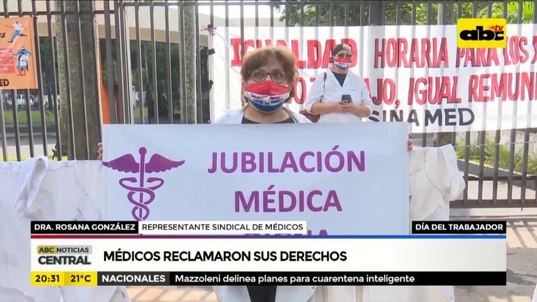 Este artículo tiene 5 años de antigüedad Galenos se manifestaron hoy frente a Mburuvicha Róga, exigiendo el cumplimiento de la ley de jubilación médica, garantías de seguridad laboral ante la pandemia de COVID-19 e igualdad salarial en el rubro.