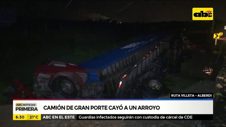 Este artículo tiene 5 años de antigüedad Un camión de gran porte que llevaba un cargamento de carbón volcó y cayó en un cauce hidrico al costado de la ruta Villeta-Alberdi en una zona de obras viales. El conductor tuvo golpes, pero sin consideración.