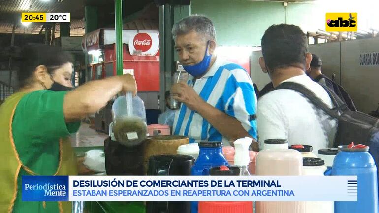 Este artículo tiene 4 años de antigüedad Comerciantes y vendedores de boletos de la Terminal de Ómnibus de Asunción lamentan que la apertura de fronteras con la Argentina finalmente no se haya dado en la fecha prevista. Éstos esperaban tener un ingreso relativamente más importante desde este fin de semana, pero con esta decisión se resignan a seguir aguantando con casi nula ganancia.