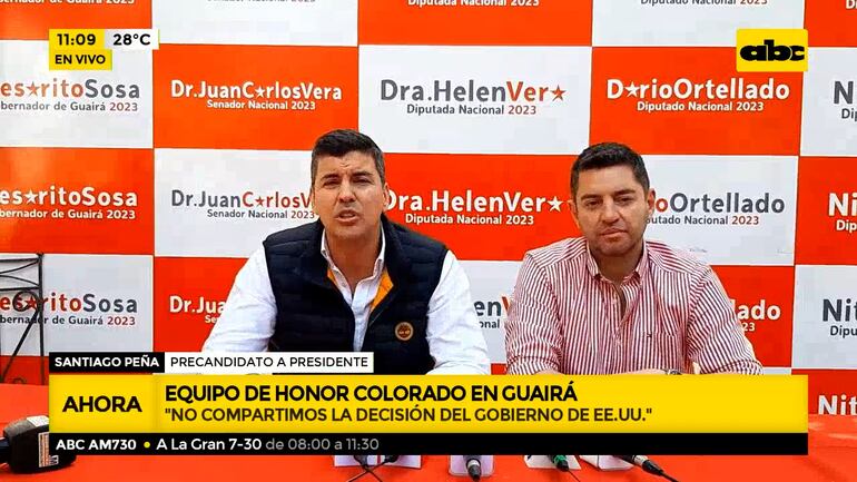 Este artículo tiene 3 años de antigüedad Conferencia de prensa del equipo de Honor Colorado en Guairá. “Enviamos toda nuestra solidaridad a Horacio Cartes y no compartimos la decisión del gobierno Americano”, precandidato a la presidencia, Santiago Peña.