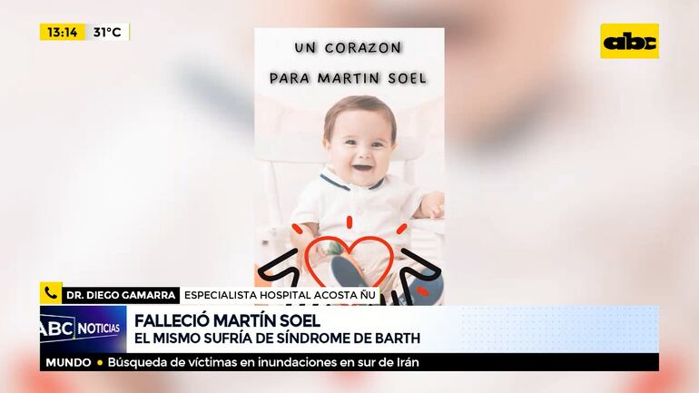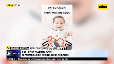 Este artículo tiene 3 años de antigüedad Este lunes, desde el Hospital Pediátrico Niños Acosta Ñu confirmaron el deceso del pequeño Martín Soel, de un año, quien estaba a la espera de un donante de corazón. El niño iba a ser conectado a un corazón artificial, pero sus condiciones clínicas se complicaron, impidiendo la realización del procedimiento. Además, los insumos para la cirugía no llegaron.