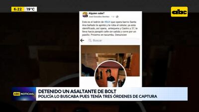Este artículo tiene 3 años de antigüedad Un joven de 19 años identificado como Arturo Daniel Ortola Armoa, con tres órdenes de captura por robo y tentativa de homicidio fue detenido en el barrio Santa Ana de Asunción. Según la Policía y denuncias de las víctimas, el sujeto perpetró varios asaltos “en el bajo” a conductores que trabajan en la plataforma Bolt e incluso fue escrachado por redes sociales.