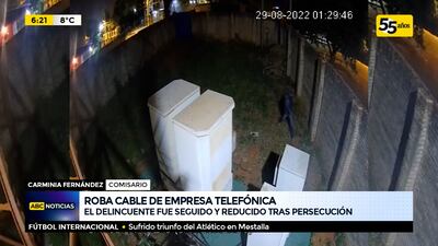 Este artículo tiene 3 años de antigüedad Un sujeto de 34 años identificado como Jorge Luis Pineda Espínola fue detenido por supuestamente haberse llevado 30 metros de cable de la antena de una empresa de telefonía. Los guardias privados lo habían visto en circuito cerrado y salieron en busca del presunto ladrón, que fue seguido y reducido en otro sitio fuera del local de la empresa. El hecho ocurrió en en el barrio Laurelty de San Lorenzo.