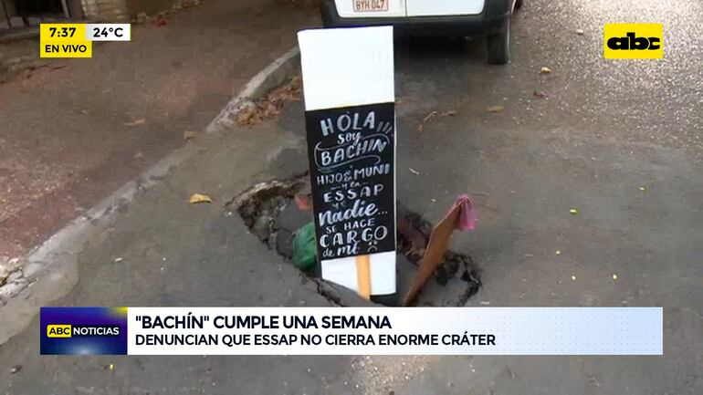 Este artículo tiene 2 años de antigüedad Bachín, es el enorme cráter a cuadras de Gral. Santos. ”Soy hijo de la Muni y la Essap y nadie se hace cargo de mi”. El bache cumple una semana y los vecinos lo “celebran” con un letrero.