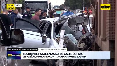 Este artículo tiene 2 años de antigüedad Poco antes de las 05:00 ocurrió un accidente de tránsito que involucró a un automóvil y un camión basurero, resultando víctima fatal un joven de 30 años; el hecho ocurrió sobre la avenida Defensores del Chaco de Asunción.