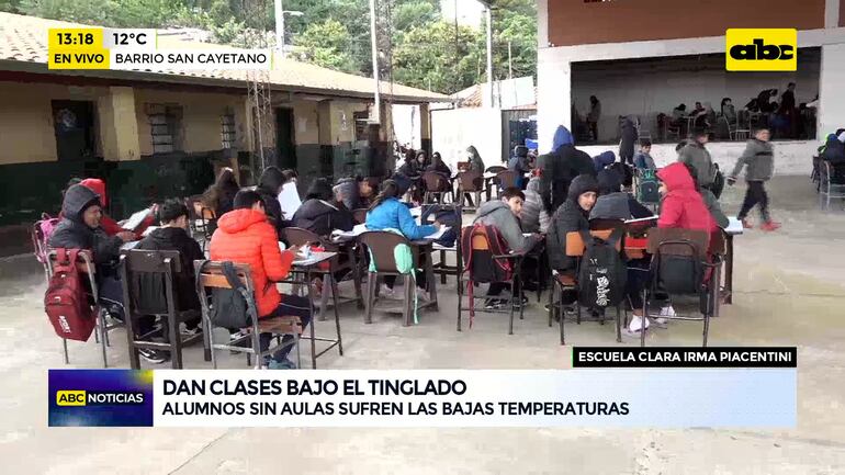 Este artículo tiene 2 años de antigüedad Estudiantes secundarios de la escuela y colegio Clara Irma Piacentini del barrio San Cayetano, zona conocida como Bañado Sur, dan clases bajo un tinglado, sin pizarras, ante la falta de salones de clase.