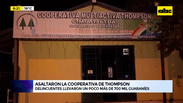 Este artículo tiene 2 años de antigüedad La Cooperativa Thompson Limitada de la Colonia Thompson fue asaltada y los delincuentes se llevaron un poco más de 720 mil guaraníes. Los dos asaltantes llegaron en una motocicleta, ingresaron al local como queriendo asociarse a la cooperativa, pero exhibiendo armas de fuego redujeron a la cajera pidiendo el dinero.