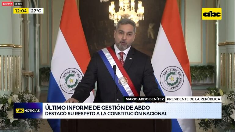 Este artículo tiene 2 años de antigüedad Mario Abdo Benítez presentó ante el Congreso Nacional su último informe de gestión como presidente de Paraguay. La exposición del mandatario fue de forma virtual y presencial.