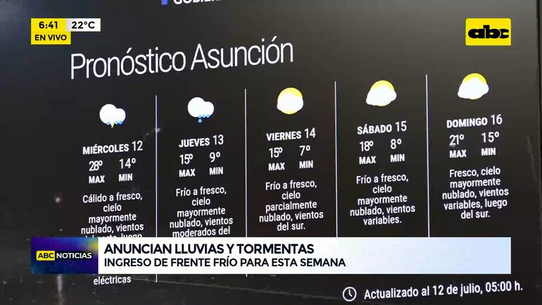 Este artículo tiene 2 años de antigüedad Ingreso de frente frío para esta semana. “Se prevé que durante la jornada una tormenta vaya avanzando por Asunción, Paraguarí y alcanzaría el norte en horas de la noche. Después de las tormentas, esta noche se va a sentir mas fresco con vientos del viento sur. Podría descender a 12 °C o 14°C”, expresó Celia Sanguinetti, meteoróloga.