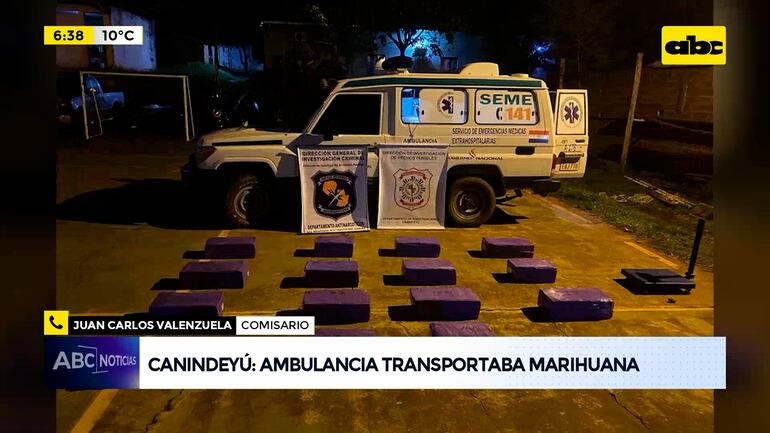 Este artículo tiene 2 años de antigüedad Efectivos de Investigación de Canindeyú retuvieron a una ambulancia que transportaba una carga importante de marihuana. El chofer quedó a disposición de la Fiscalía.