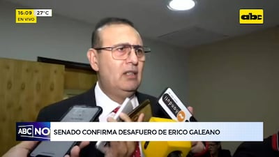 Este artículo tiene 2 años de antigüedad Por unanimidad de los 44 senadores presentes, incluido el propio afectado, la Cámara de Senadores confirmó en sesión ordinaria el desafuero del senador cartista Erico Galeano, quien está imputado por presunto lavado de dinero y asociación criminal en el marco del operativo A Ultranza Py. El equipo fiscal pide la prisión preventiva, que ahora debe ser definida por el juez Gustavo Amarilla.