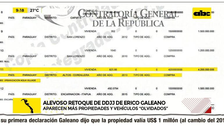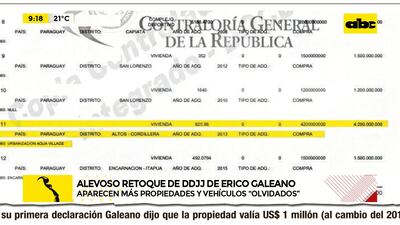 Este artículo tiene 2 años de antigüedad El senador cartista Erico Galeano, desaforado la semana pasada y que está imputado por presunta asociación criminal y lavado de dinero vinculado al operativo “A Ultranza PY”, rectificó considerablemente por segunda vez su declaración jurada presentada en junio de 2018. Y aparecen más propiedades y vehículos “olvidados” por el legislador colorado.