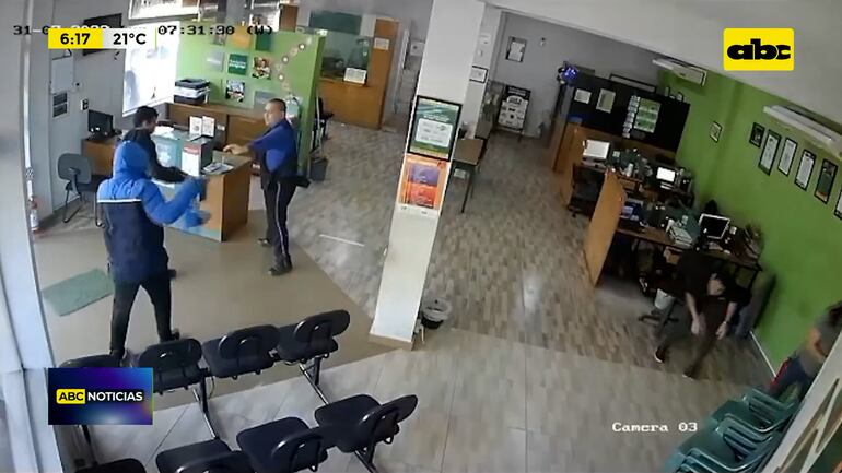 Este artículo tiene 2 años de antigüedad Dos delincuentes ingresaron a la sede de la Fundación paraguaya ubicada en el centro de la ciudad de Itá. En un poco más de cuatro minutos se alzaron con 10 millones de guaraníes tras romplerle la cabeza al guardia y reducir al resto de los empleados. Ambos tenían armas. Incluso dispararon al aire al ingresar. Todo quedó grabado porlas cámaras de seguridad del sitio.