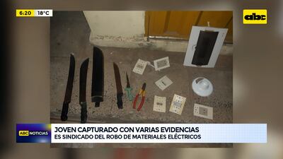 Este artículo tiene 2 años de antigüedad Un joven identificado como Juan Gabriel Báez Galeano, de 20 años, fue detenido, pues es presuntamente autor de un robo domiciliario. Según la denuncia, el joven ya estaba sacando materiales usados en una instalación eléctrica como pinzas, seis cajas de punto y toma, portafocos y una caja portatablero. La víctima llamó a la policía y los oficiales pudieron reducirlo en el barrio Villa Industrial de San Lorenzo. Tenía consigo armas blancas como un machete, dos machetillos de fabricación casera y un puñal.
